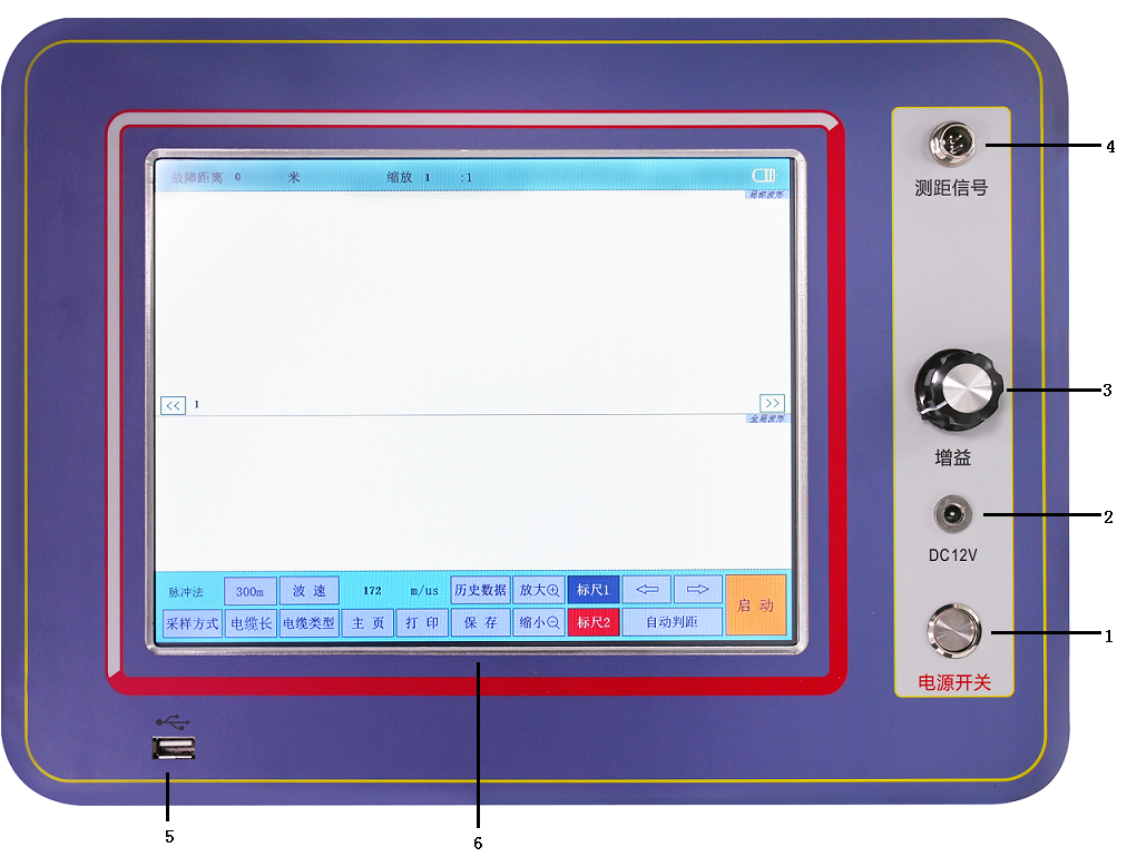 3、增益旋鈕:測量電纜故障點(diǎn)距離時(shí),順時(shí)針旋動(dòng)幅度增大;逆時(shí)針旋動(dòng)幅度減小。(需采樣刷新才有變化)