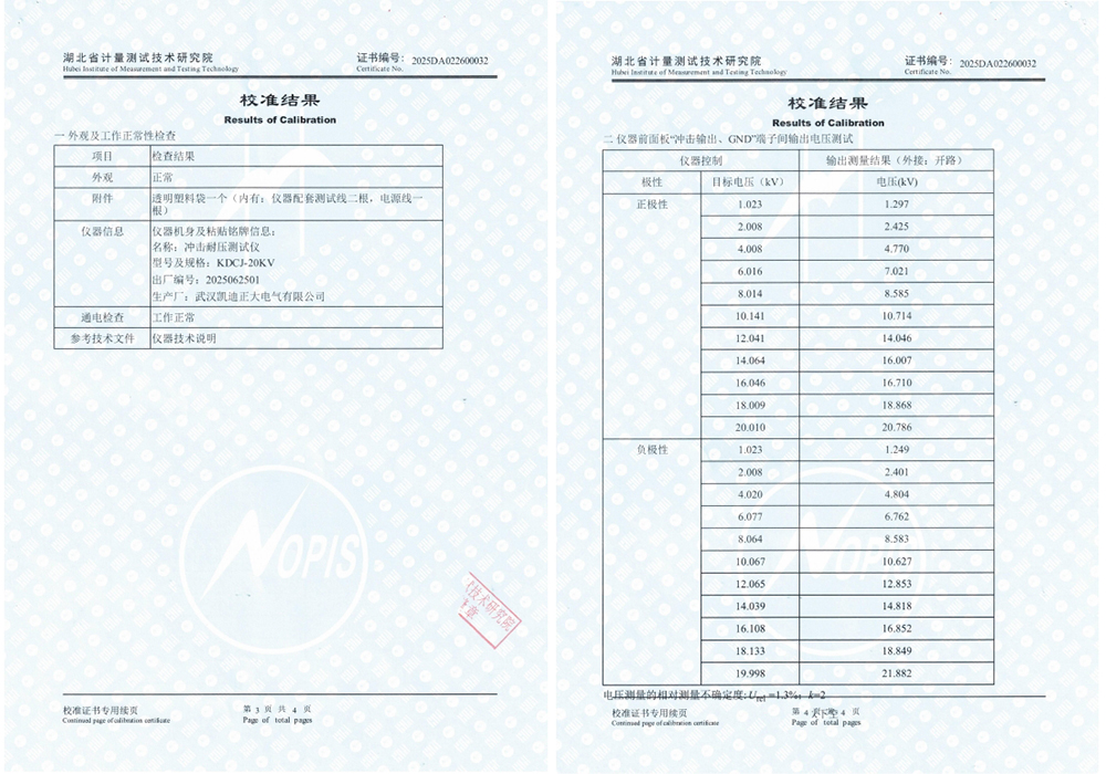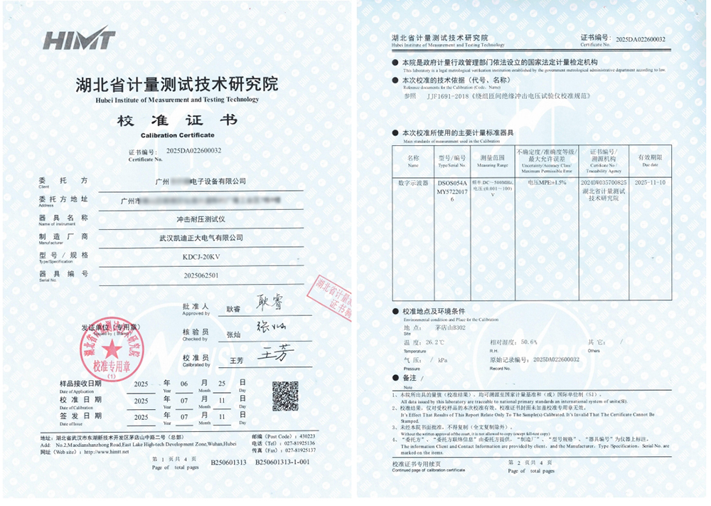 2025年7月11日,廣州某電子設備有限公司向武漢凱迪正大電氣采購的KDCJ-20kV沖擊耐壓測試儀,通過湖北省計量測試技術(shù)研究院的專業(yè)校準,驗證了測試儀的準確性和可靠性。