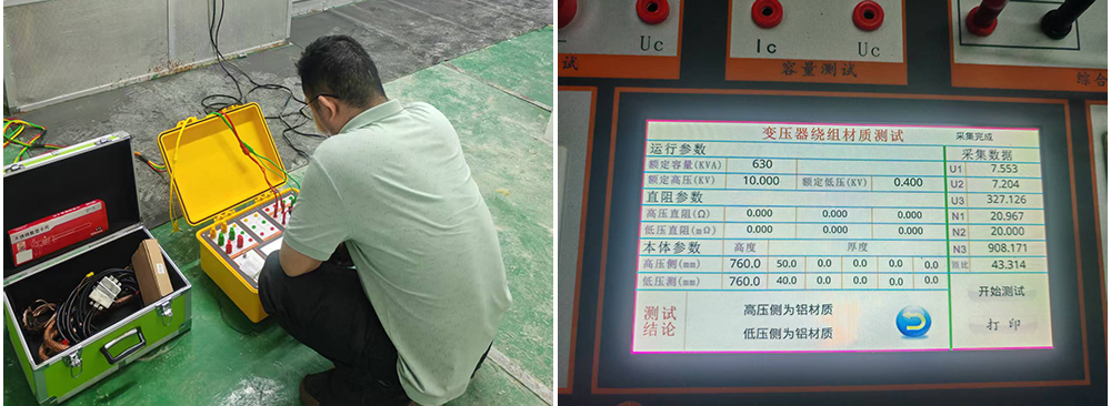 檢測(cè)操作:按照儀器操作規(guī)程,將儀器與變壓器的高壓側(cè)、低壓側(cè)繞組連接,采集相關(guān)數(shù)據(jù),包括額定容量、額定高壓、額定低壓、直阻參數(shù)等。