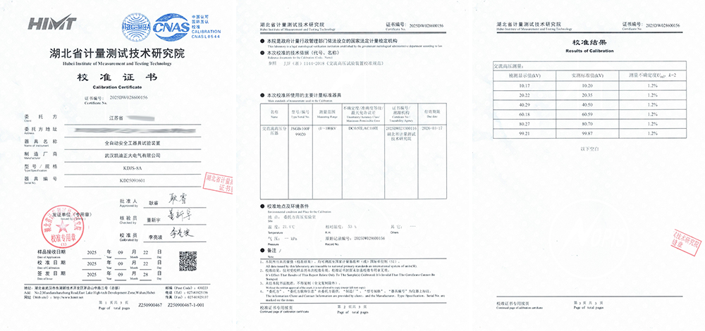 江蘇某灌溉單位采購武漢凱迪正大KDJS-8A型全自動安全工器具試驗裝置,經(jīng)湖北省計量測試技術(shù)研究院嚴(yán)格校準(zhǔn),取得了編號為2025DW028600156的校準(zhǔn)證書。